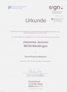 Für unsere Kalibrierlehren K1 bis K3 wurde unsere Firma im Jahre 2009 mit dem Signo Preis vom Institut der deutschen Wirtschaft Köln ausgezeichnet.